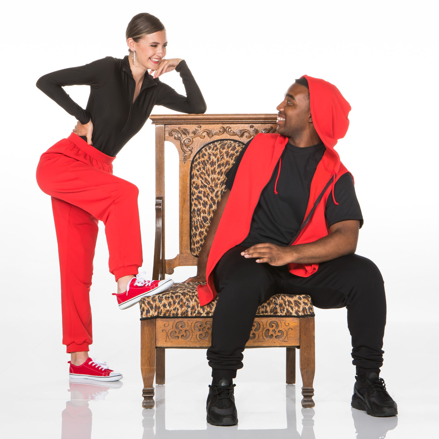 GUY/UNISEX: Red stretch fleece hooded scoop vest, black cotton t-shirt and black stretch fleece joggers.