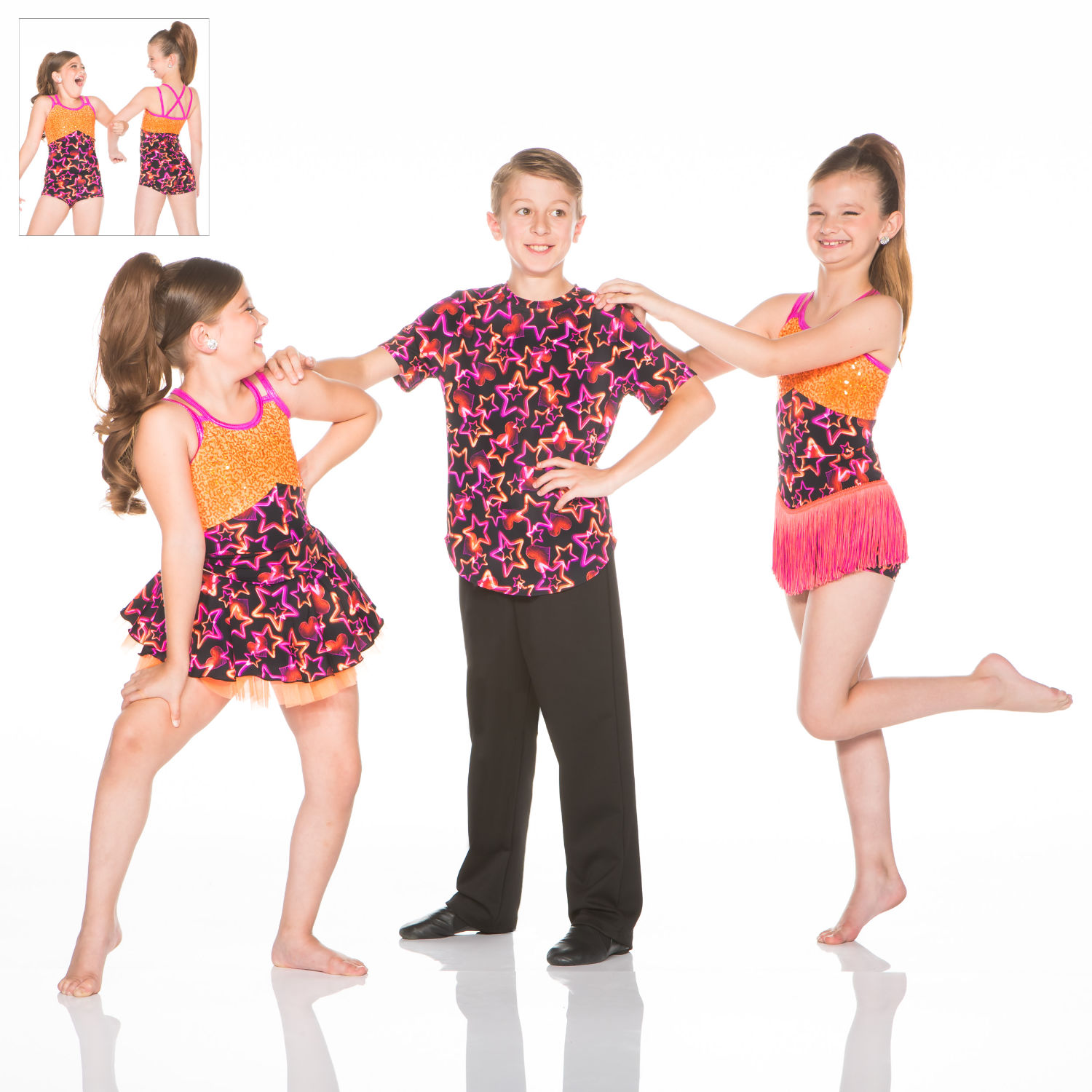 GIRLS: Double strap sequin and print bikertards, paired with either a skirt with pop of crinoline or fringe skirt. The bikertard makes this a perfect choice for combo classes. Scrunchie included.