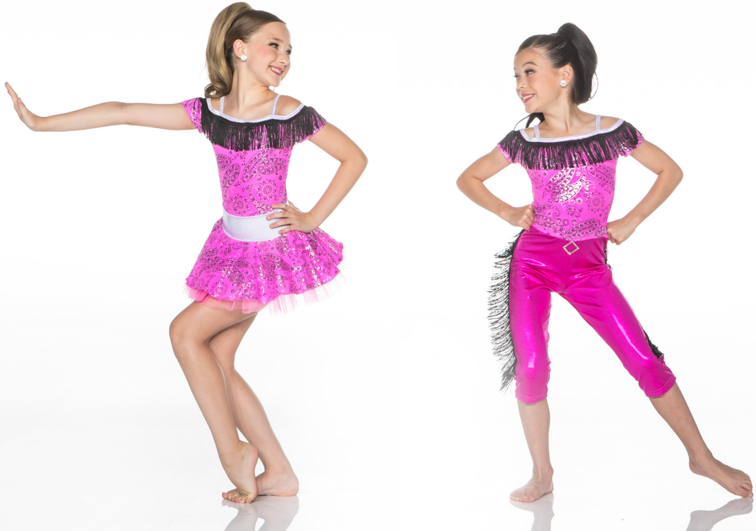 UNITARD: Off Shoulder foil print bodice attached to mystique capri leggings with fringe on outseams, accented with mystique and a rhinestone buckle. Scrunchie included.